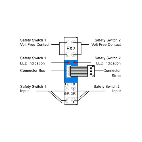 El módulo extensor FX2 agrega dos entradas de interruptor de seguridad a un sistema de seguridad Serie F. Se conecta mediante una correa integrada de 6 vías al módulo de control FM1 adyacente (o módulo extensor) y tiene la salida de indicación, LED y contacto libre de voltaje para cada interruptor.